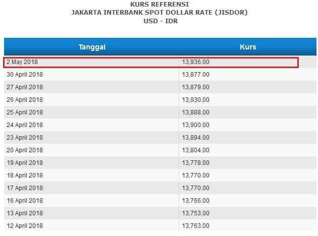 Dalam perdagangan hari ini kurs rupiah terhadap Dolar AS justru menurun dalam sesi perdagangan awal hari rabu pagi. Dair keterangan JISDOR pasangan USD/IDR berada diposisi 13.936, kurs tersebut menjadi yang paling rendah dari tanggal 12 April.